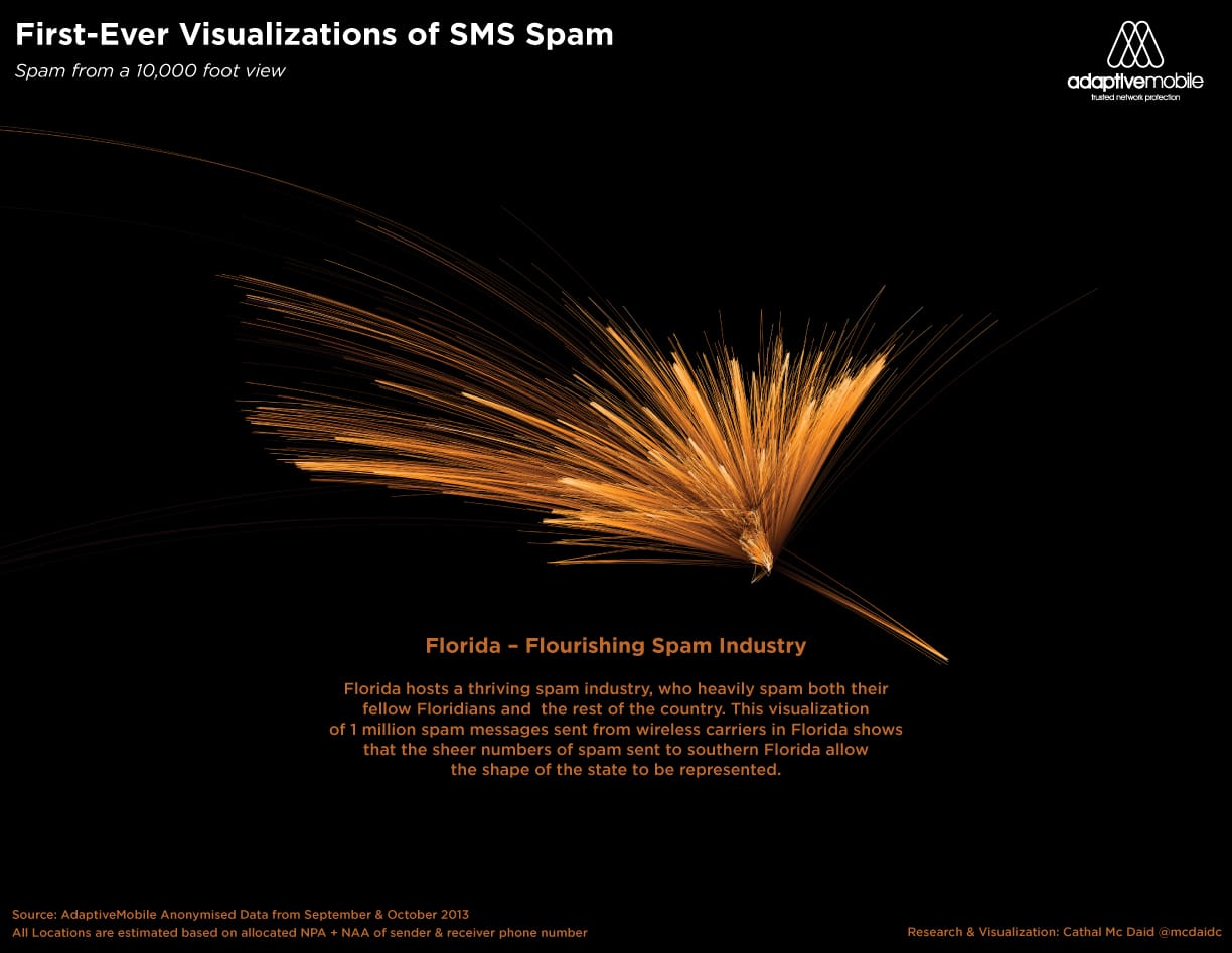 Dallas – December 4, 2013 – AdaptiveMobile, the leader in mobile security, today issued an industry-first snapshot of SMS traffic across the United States, which shows ground-breaking visualizations of text messaging spam based on the mobile phone’s geographical location, as well as the industry’s first comprehensive map of the sources and targets of mobile spam in the United States. This two-month snapshot shows that mobile phones in South Florida, Dallas and Chicago were targeted with the highest levels of SMS spam. During this period, Los Angeles generated the most spam in the United States and was responsible for a pump-and-dump scam which “exploded” across the United States. South Florida was the next highest generator, hammering the Miami area with a “Junk Car” spam campaign.