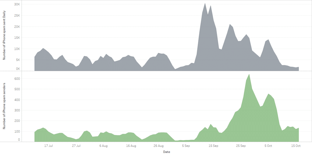 Since then, however there was a large escalation in sending activity. Cumulatively, (including July and August) by mid October we had detected over 11,500 phone numbers sending these messages, who had sent over 750k SMS messages. - To show this, the top graph below, is a moving average of total SMS spam activity from these iPhones detected within our customer operators in North America. You can see that the number of messages peaked in mid-September, and since then the overall volumes have declined. However, in the bottom graph, again using a moving average we can see that the number of active senders per day peaked later – at the end September/start October, and has actually remained higher than it was before the increase in mid-September.