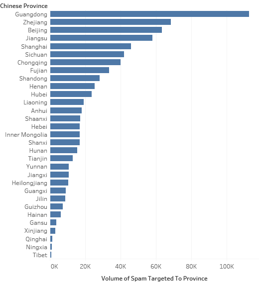 Vertical histogram displaying the volume of iPhone gambling spam targeted per Province